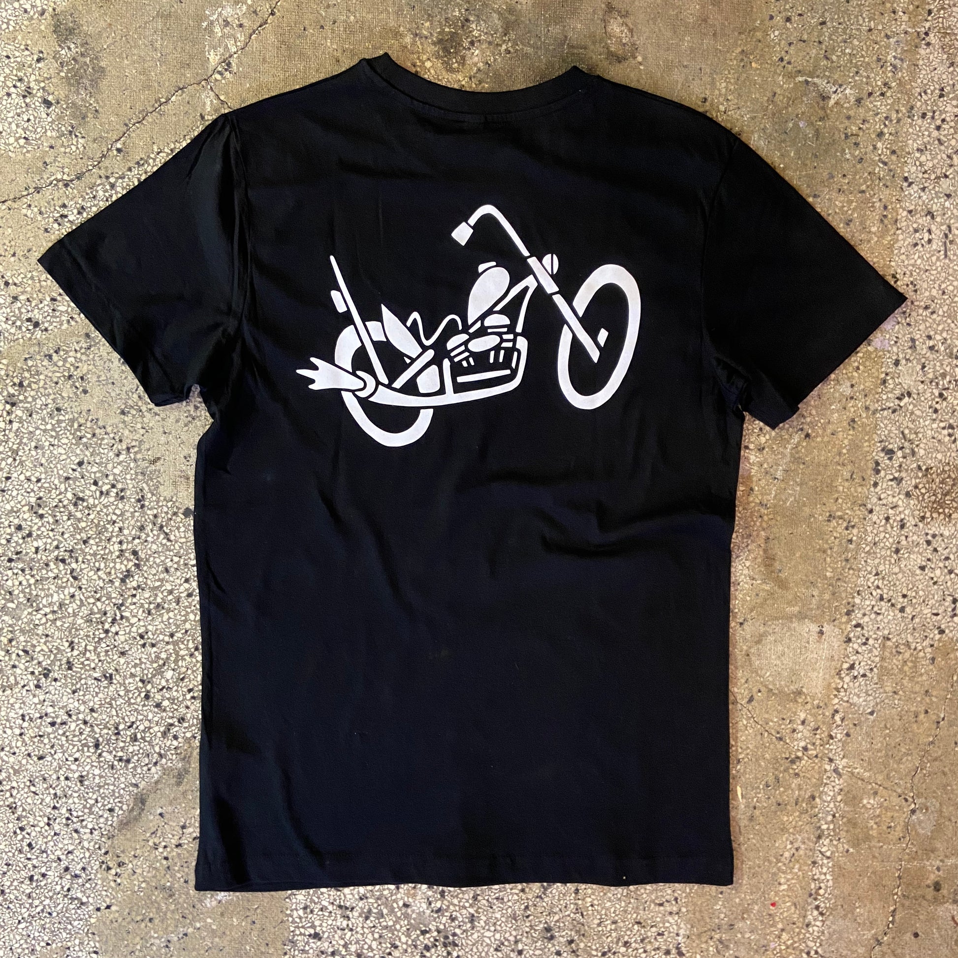 The Rusty Gold chopper tee rocks a new logo on the chest with some serious seventies vibe going on. And like the name of the tee suggests, a big chopper on the back, popping a wheelie! Why not right?