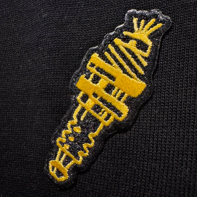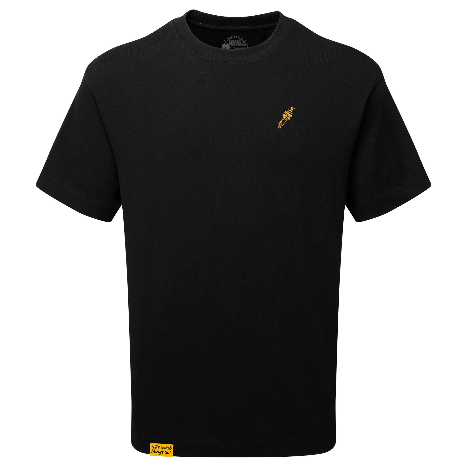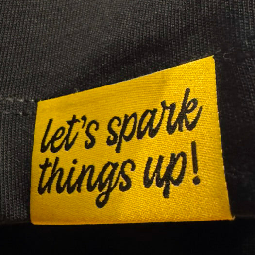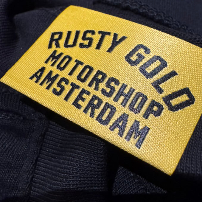 A tiny embroidered Rusty Gold spark plug on the chest and a double sided woven label at the bottom. Plenty ;-)