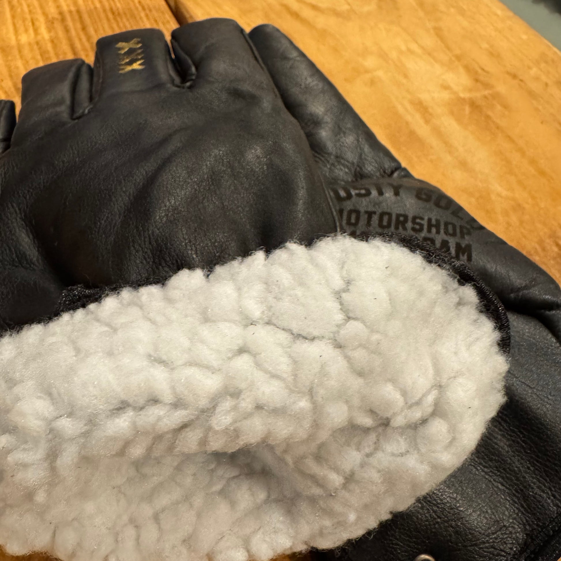 Pitch black, super supple cow hide leather, a new warm sherpa lining and a sh!t load of Rusty Gold attitude.
